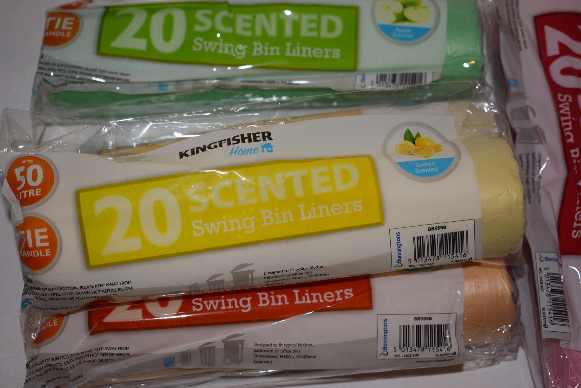 Item: (Condition 1) Kingfisher Home Scented Swing Bin Liners 50L x20. Various colours randomly selected from stockpile (4th picture).