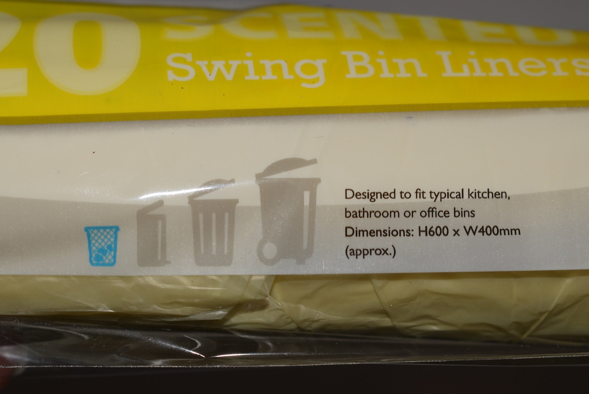 “Designed to fit typical kitchen, bathroom or office bins. Dimensions: H600mm x W400mm (approx.)” (Calculation evidently based on straight side bins, curved side bins of the same approximate size equal a larger dimension)